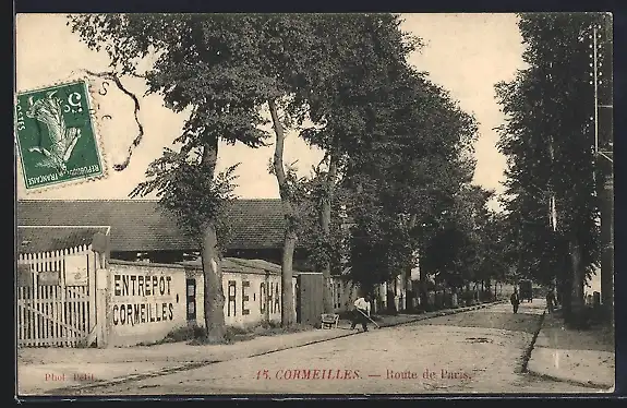AK Cormeilles, route de Paris avec entrepôt et arbres alignés