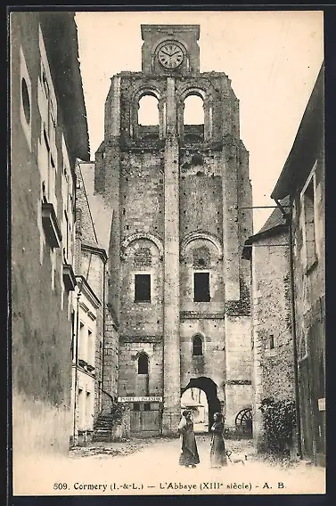 AK Cormery, L`Abbaye du XIIIe siècle avec clocher imposant et passants