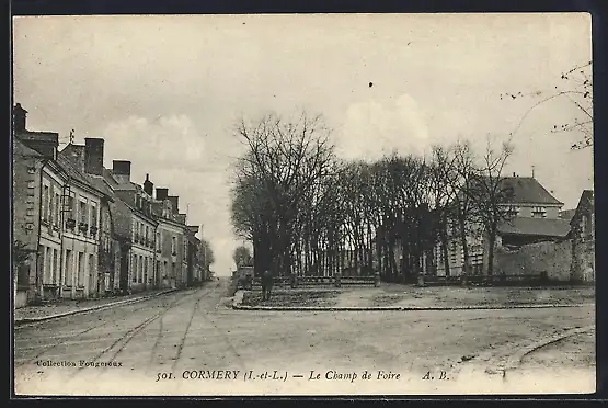AK Cormery, Le Champ de Foire avec des arbres et des maisons alignées le long de la rue