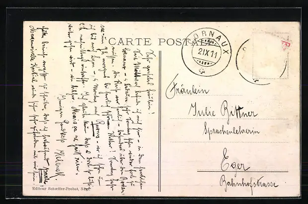 gelaufen 1911, Briefmarke entfernt, Eckknick li. oben, guter Zustand