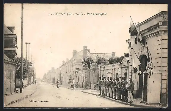 AK Corné, Rue principale avec soldats alignés devant un bâtiment décoré de drapeaux