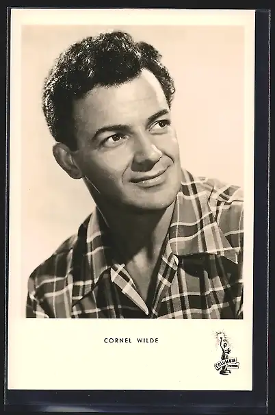 AK Cornel Wilde im offenen karierten Hemd, Portrait