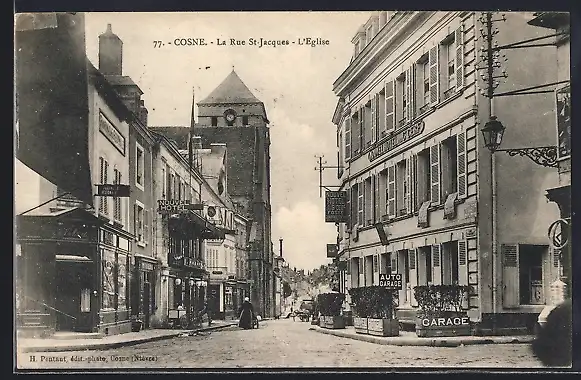 AK Cosne, La Rue St-Jacques et L`Église avec commerces et garage