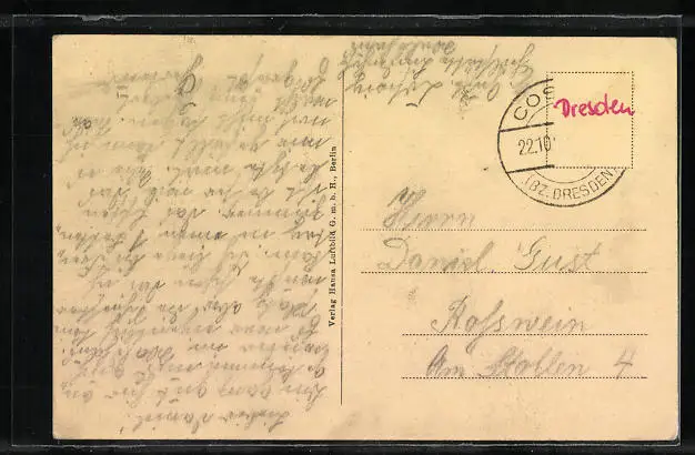 Personenbezogene Daten auf der Rückseite der Karte wurden durch blauen Textmarker unkenntlich gemacht. Die blauen Stellen sind auf die Vorderseite durchgeweicht und wirken sich negativ auf das Postkartenfoto aus