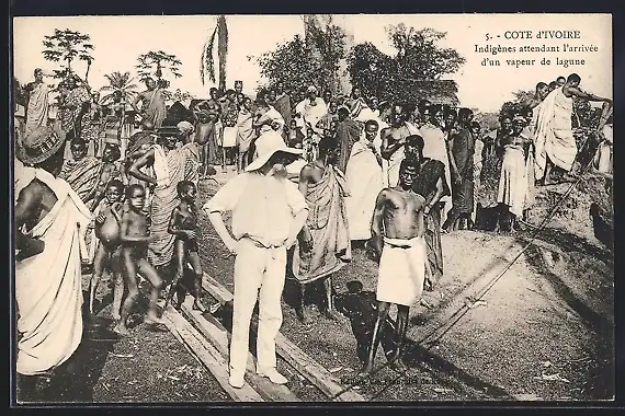 AK Cote d`Ivoire, Indigènes attendant l`arrivée d`un vapeur de lagune