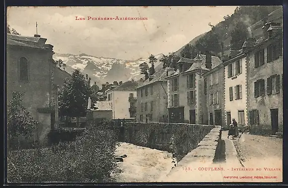 AK Couflens, Intérieur du village avec vue sur les Pyrénées enneigées