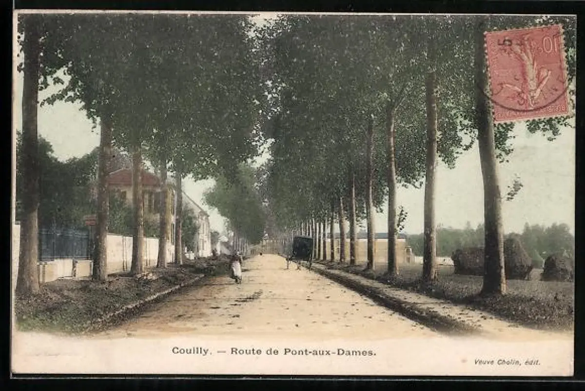 AK Couilly, Route de Pont-aux-Dames avec arbres alignés et vue de la rue animée