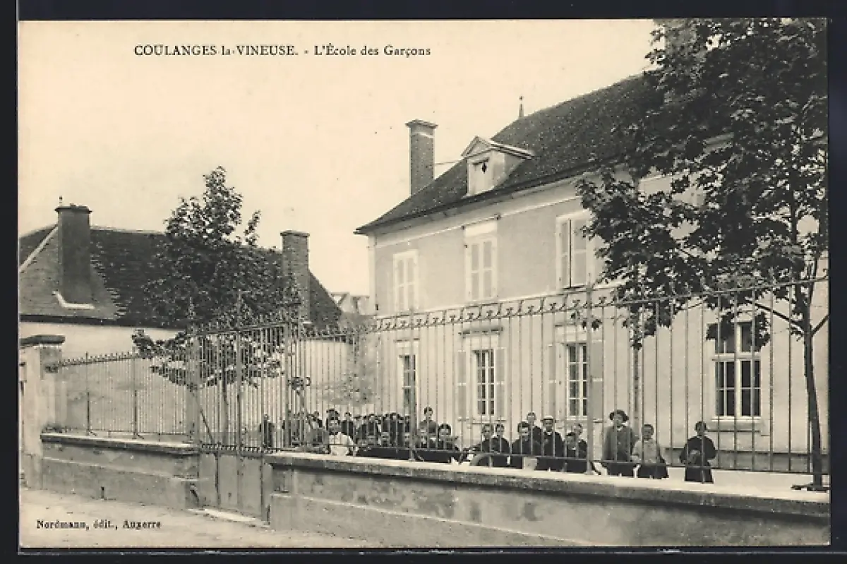 AK Coulanges-la-Vineuse, L`École des Garcons avec élèves devant le bâtiment