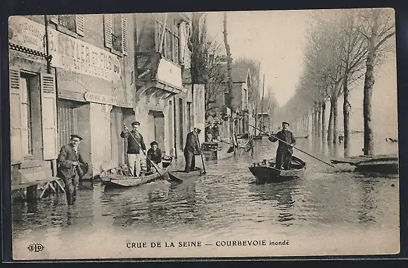 AK Courbevoie, Crue de la Seine avec barques dans la rue inondée