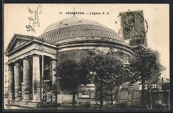 AK Courbevoie, L`Église P.F. avec facade et arbres devant