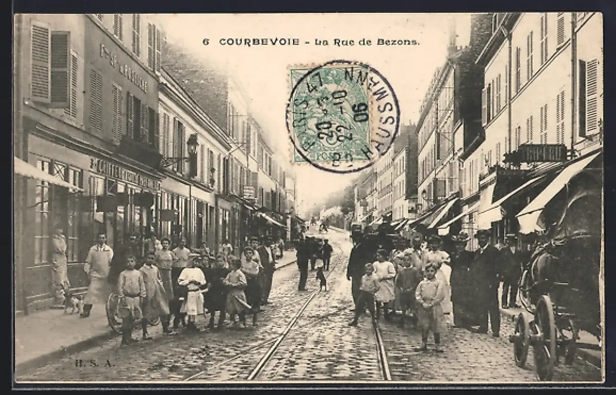 AK Courbevoie, La Rue de Bezons avec passants et calèche