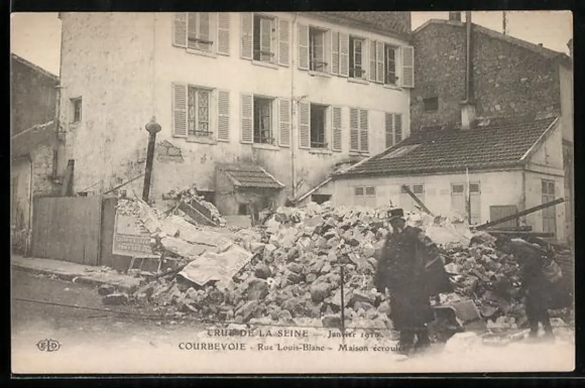 AK Courbevoie, Rue Louis-Blanc inondée avec maison écroulée, Crue de la Seine 1910