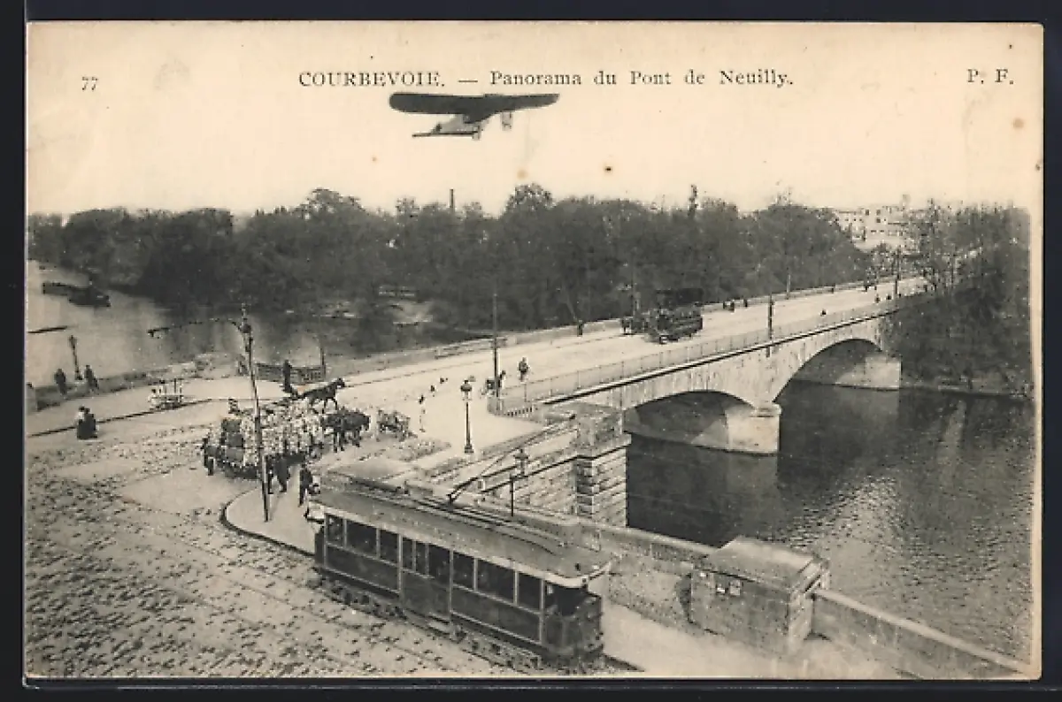 AK Courbevoie, Strassenbahn an der Brücke, Le Pont de Neuilly, Flugzeug