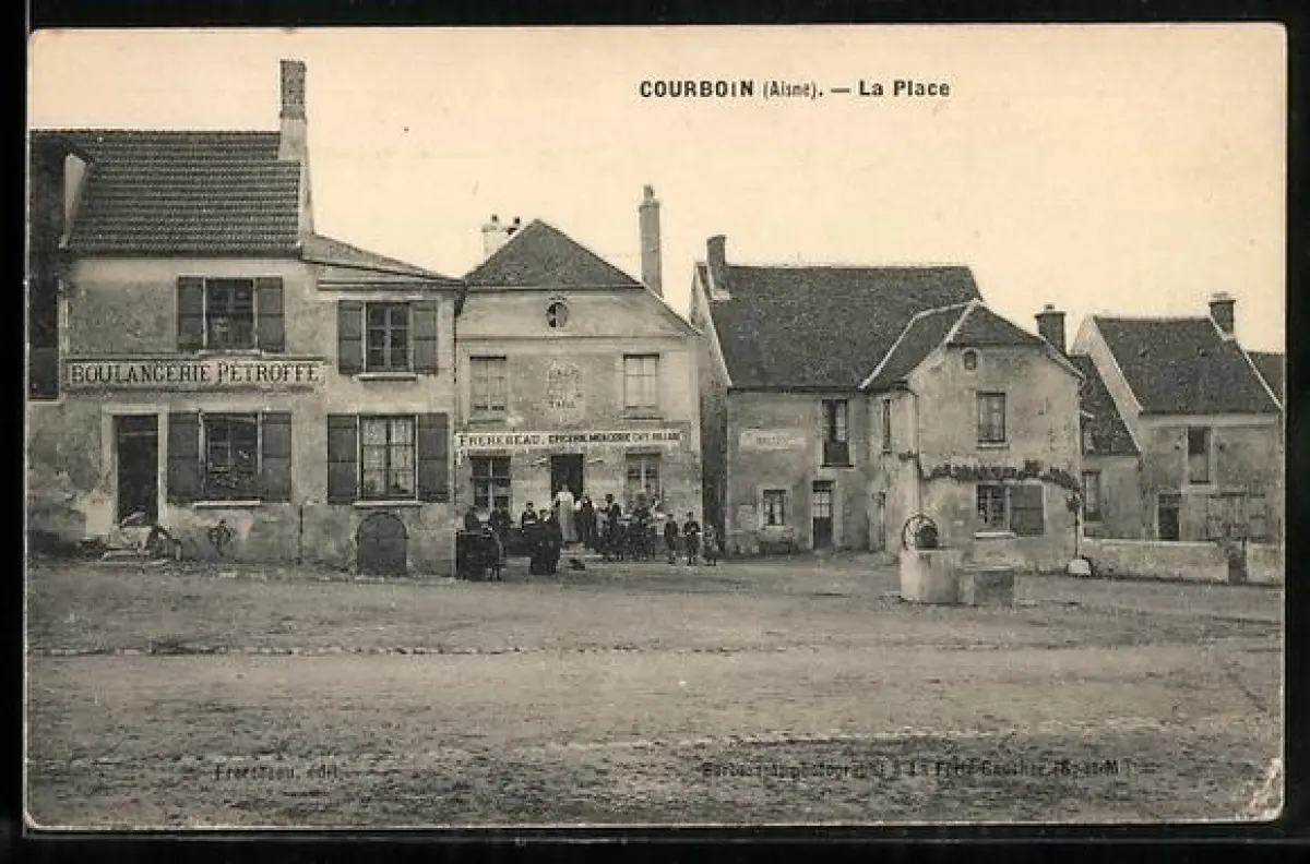 AK Courboin /Aisne, La Place avec boulangerie et habitants rassemblés