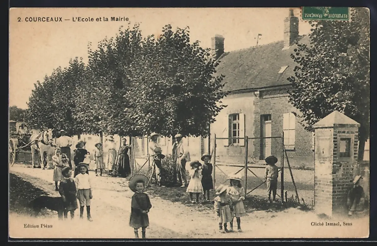 AK Courceaux, L`École et la Mairie avec des enfants et une calèche sur le chemin