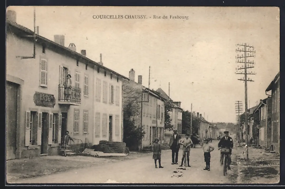 AK Courcelles Chaussy, Rue du Faubourg avec passants et cycliste