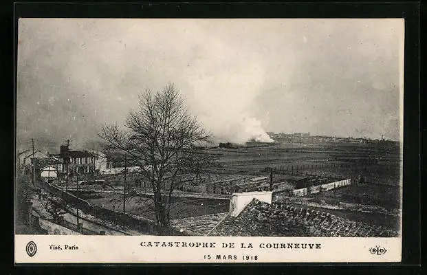 AK Courneuve, Catastrophe, 15 Mars 1918, Blick über die Ruinen der Stadt, eine Raucsäule im Hintergrund, Explosion