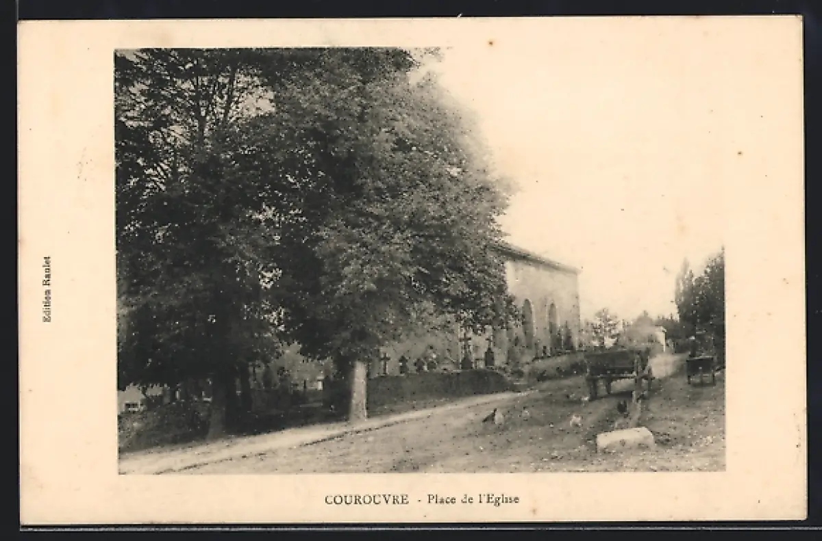 AK Courouvre, Place de l`Église avec arbres et calèche