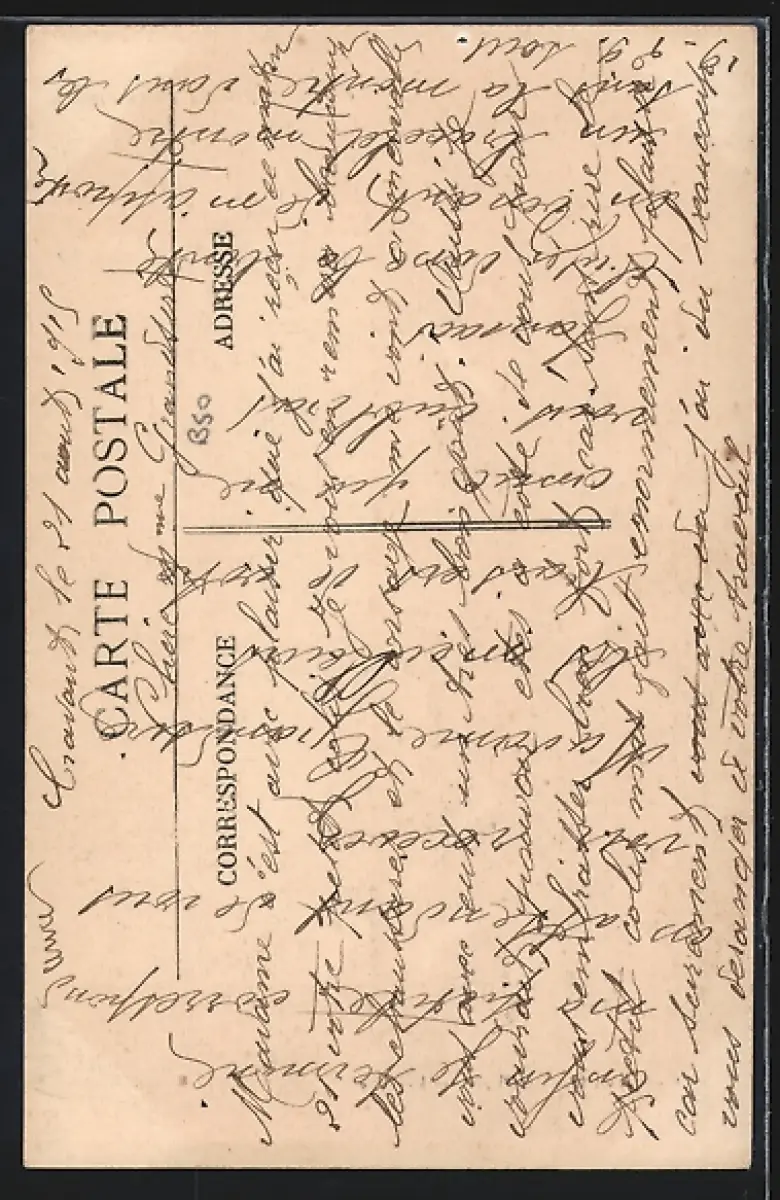 Personenbezogene Daten auf der Rückseite der Karte wurden durch blauen Textmarker unkenntlich gemacht. Die blauen Stellen sind auf die Vorderseite durchgeweicht und wirken sich negativ auf das Postkartenfoto aus