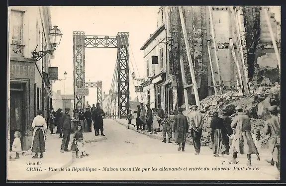 AK Creil, Rue de la République, Maison incendiée par les allemends et entrée du nouveau Pont de Fer