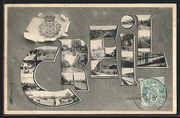 AK Creil, diverses vues de la ville intégrées dans les lettres de `Creil`