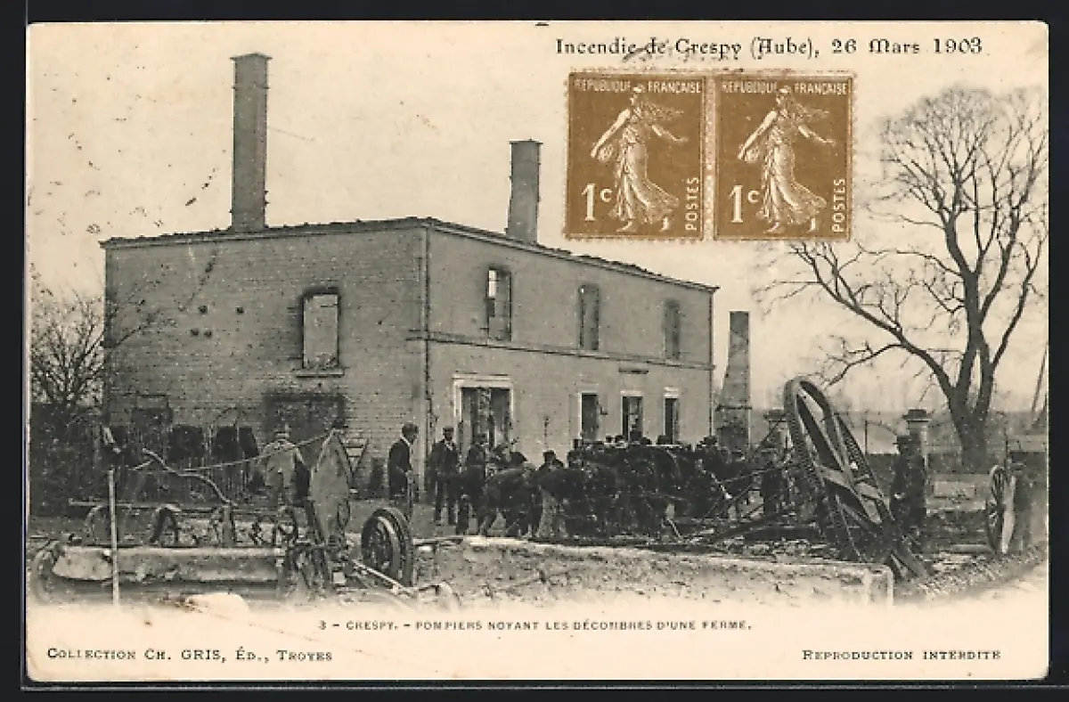 AK Crespy /Aube, Incendie de 1903, Pompiers noyant les Décombres d`une Ferme, Feuerwehr