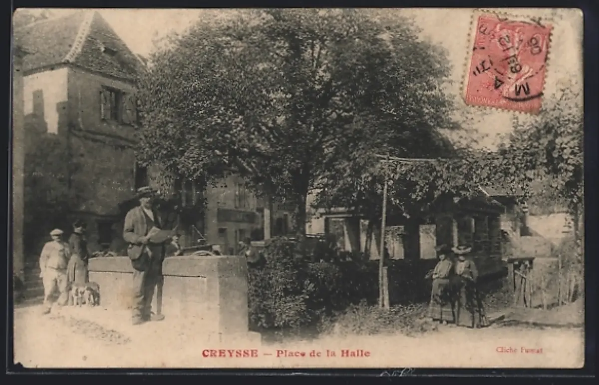 AK Creysse, Place de la Halle avec des habitants et arbres ombragés