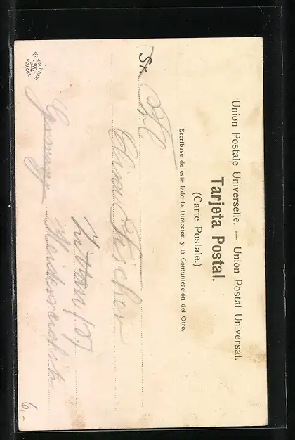 Personenbezogene Daten auf der Rückseite der Karte wurden durch blauen Textmarker unkenntlich gemacht. Die blauen Stellen sind auf die Vorderseite durchgeweicht und wirken sich negativ auf das Postkartenfoto aus