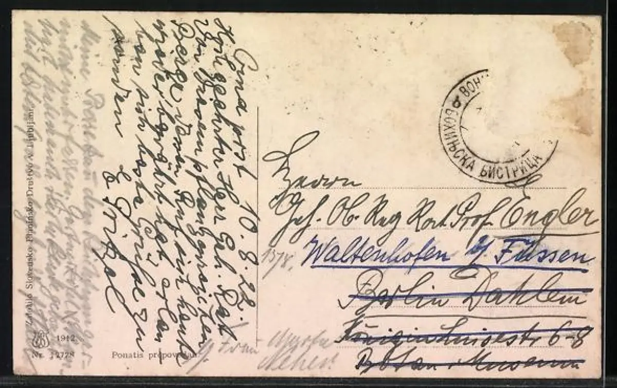 Personenbezogene Daten auf der Rückseite der Karte wurden durch blauen Textmarker unkenntlich gemacht. Die blauen Stellen sind auf die Vorderseite durchgeweicht und wirken sich negativ auf das Postkartenfoto aus