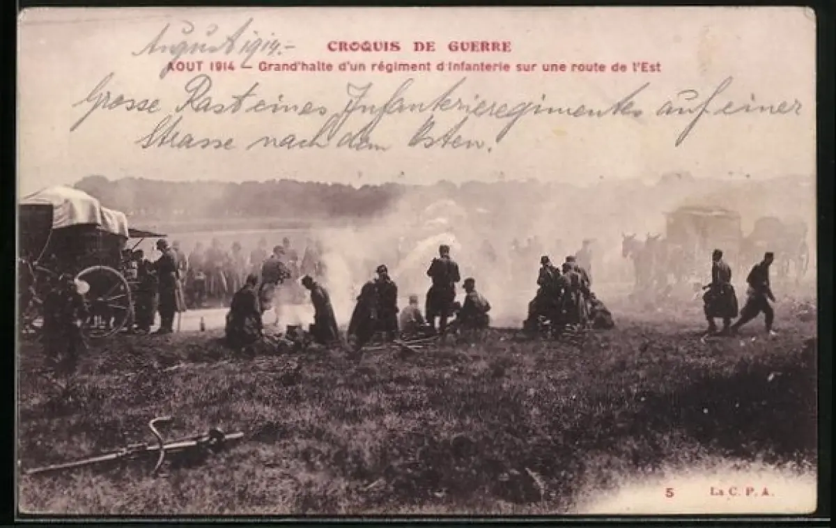 AK Croquis de Guerre, Grand`halte d`un régiment d`Infanterie sur une route de l`Est 1914, Soldaten an der Kochstelle