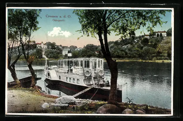 AK Crossen / Krosno Odrz, Oderpartie, Dampfer am Anleger