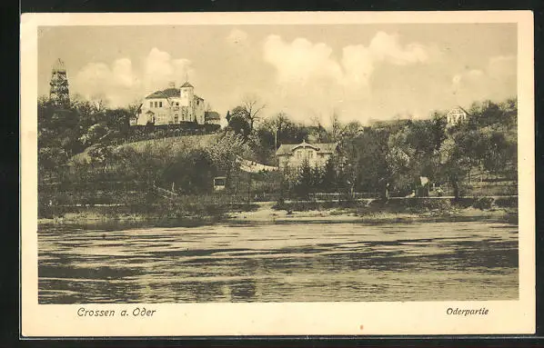 AK Crossen / Krosno Odrz, Ortsansicht mit Oderpartie