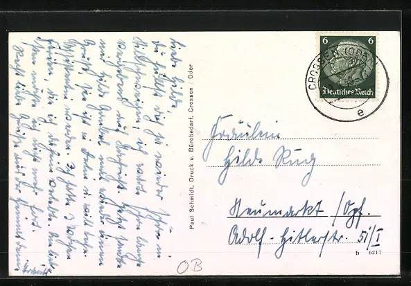 Personenbezogene Daten auf der Rückseite der Karte wurden durch blauen Textmarker unkenntlich gemacht. Die blauen Stellen sind auf die Vorderseite durchgeweicht und wirken sich negativ auf das Postkartenfoto aus
