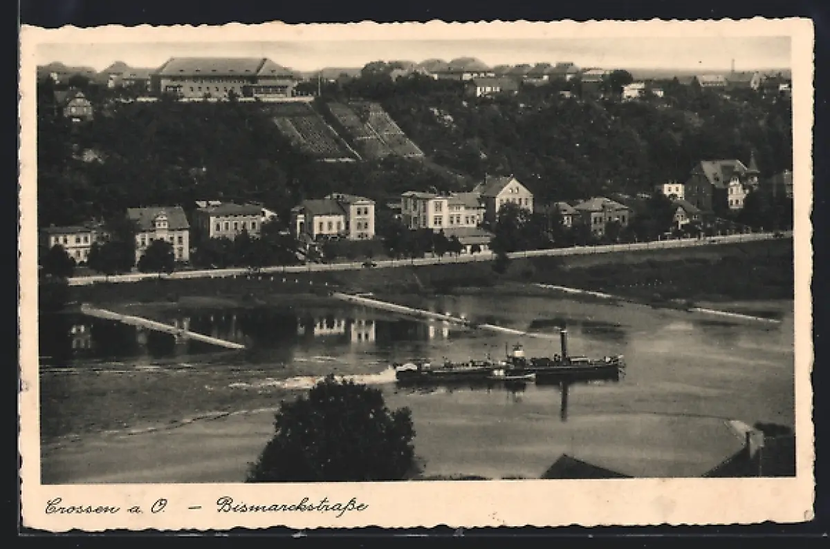 AK Crossen a. O., Bismarckstrasse mit Dampfer