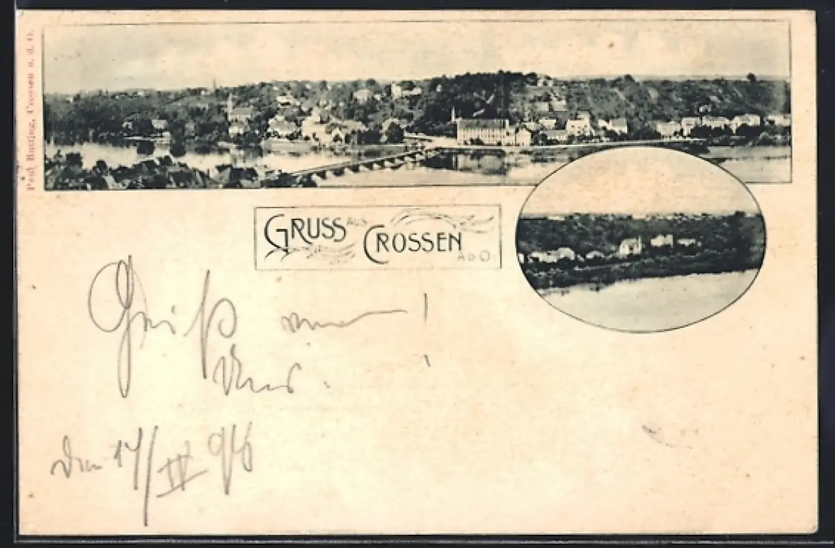 AK Crossen a. d. O., Ortsansicht mit Brücke aus der Vogelschau