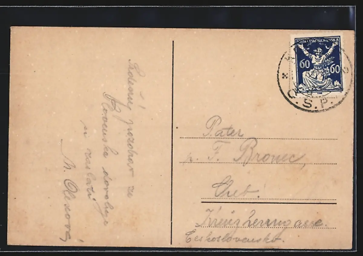 Personenbezogene Daten auf der Rückseite der Karte wurden durch blauen Textmarker unkenntlich gemacht. Die blauen Stellen sind auf die Vorderseite durchgeweicht und wirken sich negativ auf das Postkartenfoto aus