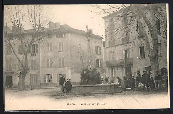 AK Cuers, Place Carnot-le-Haut avec fontaine et passants