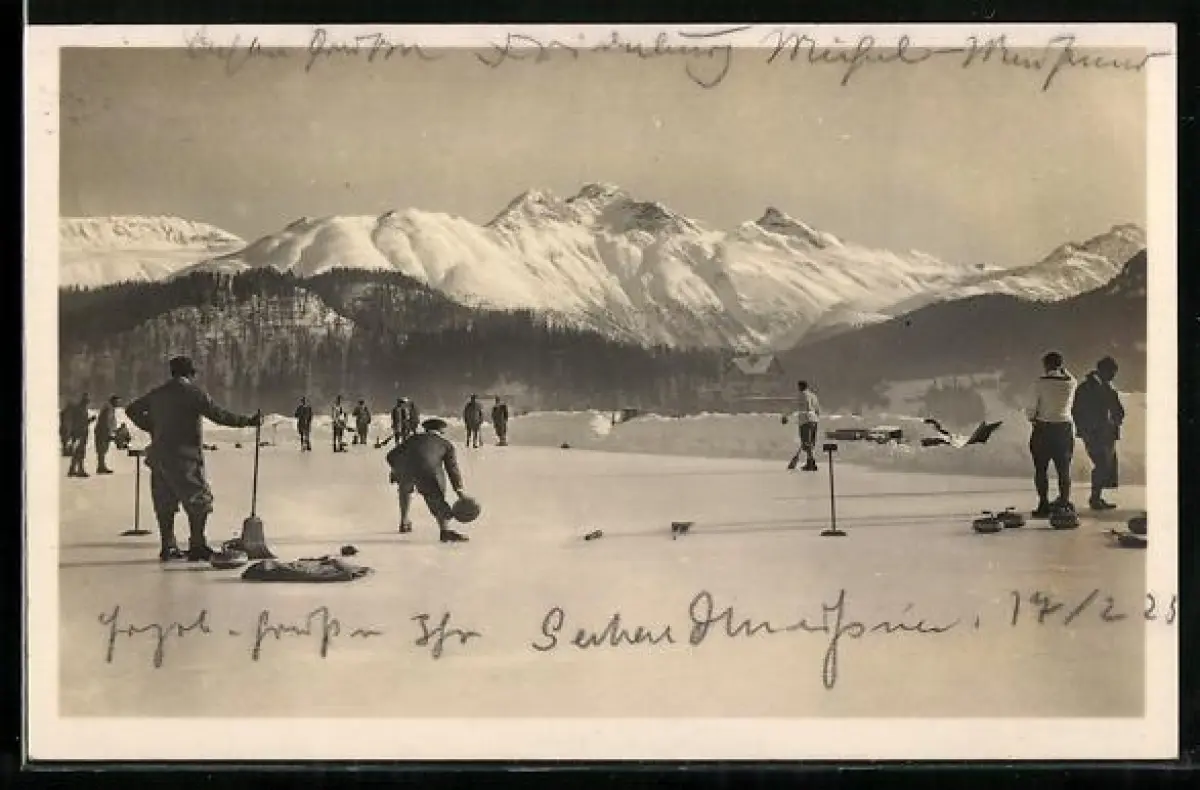 AK Curling, Wintersportler auf dem Eis mit Steinen und Besen