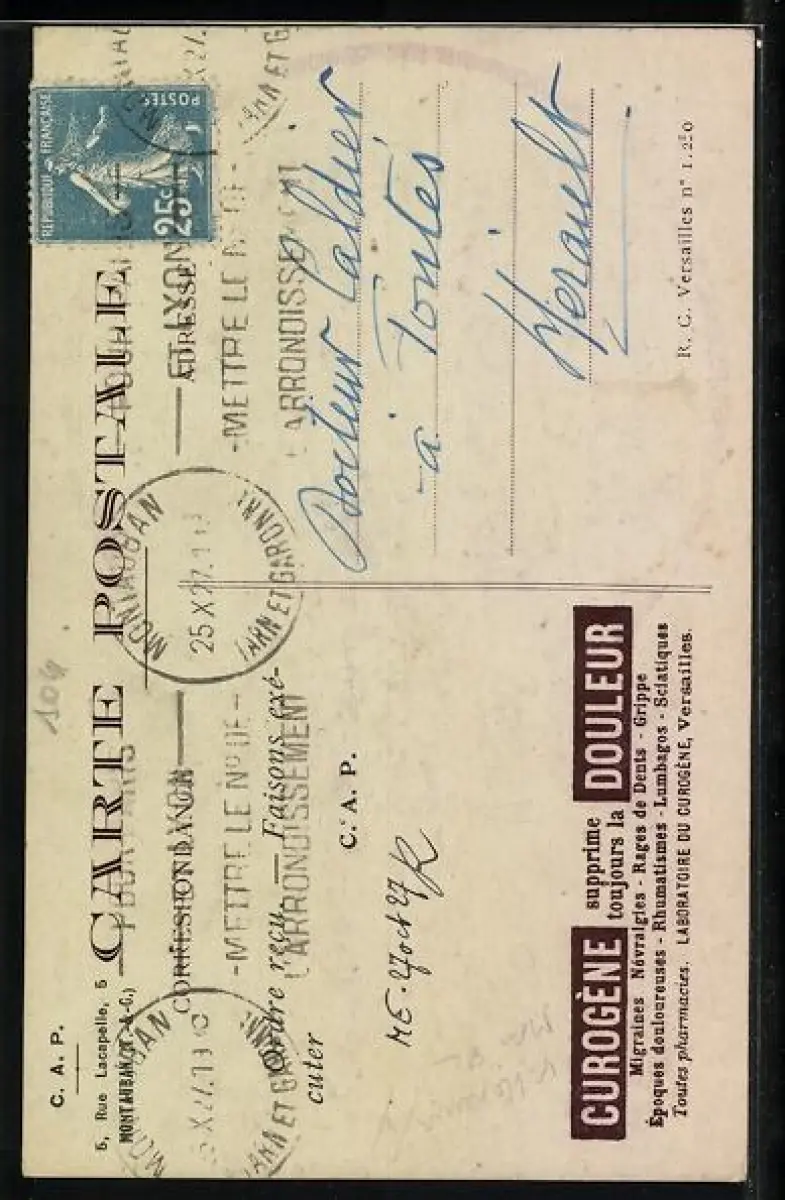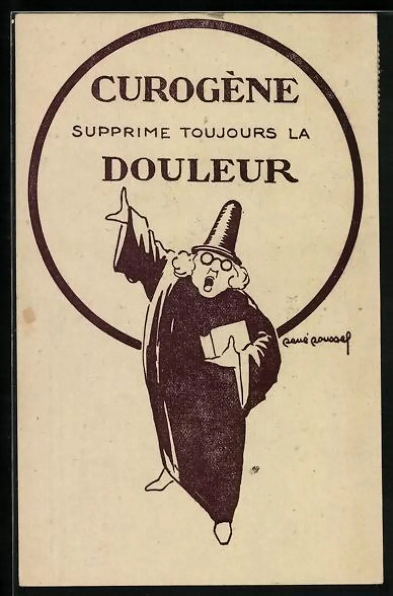 AK Curogène supprime toujours la douleur, Reklame für Schmerzmittel, Frau preist das Medikament lauthals an