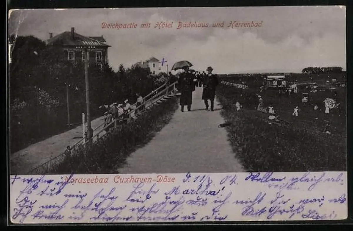 AK Cuxhaven-Döse, Deichpartie mit Hôtel Badehaus und Herrenbad