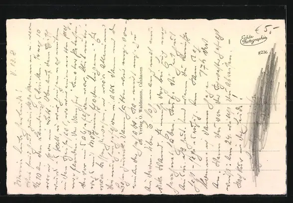Personenbezogene Daten auf der Rückseite der Karte wurden durch blauen Textmarker unkenntlich gemacht. Die blauen Stellen sind auf die Vorderseite durchgeweicht und wirken sich negativ auf das Postkartenfoto aus