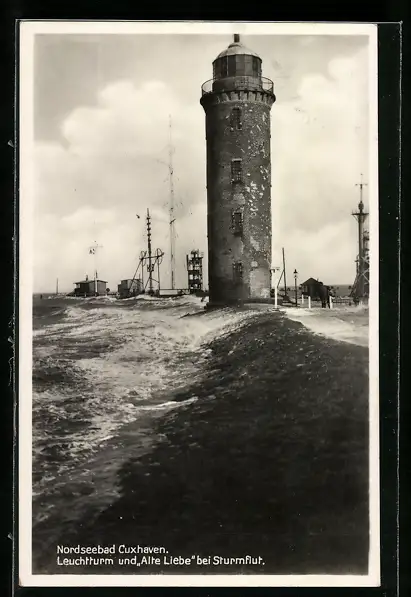 AK Cuxhaven, Leuchtturm und Alte Liebe bei Sturmflut