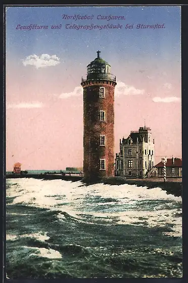 AK Cuxhaven, Leuchtturm und Telegraphengebäude bei Sturmflut