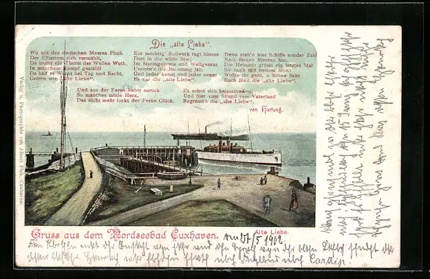 AK Cuxhaven, Seeblick mit Dampfern, Gedicht Die Alte Liebe