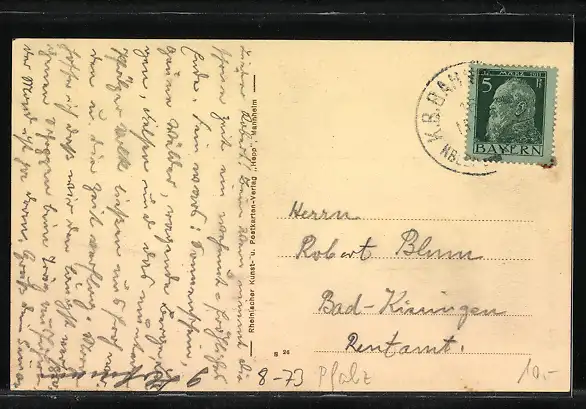 Personenbezogene Daten auf der Rückseite der Karte wurden durch blauen Textmarker unkenntlich gemacht. Die blauen Stellen sind auf die Vorderseite durchgeweicht und wirken sich negativ auf das Postkartenfoto aus