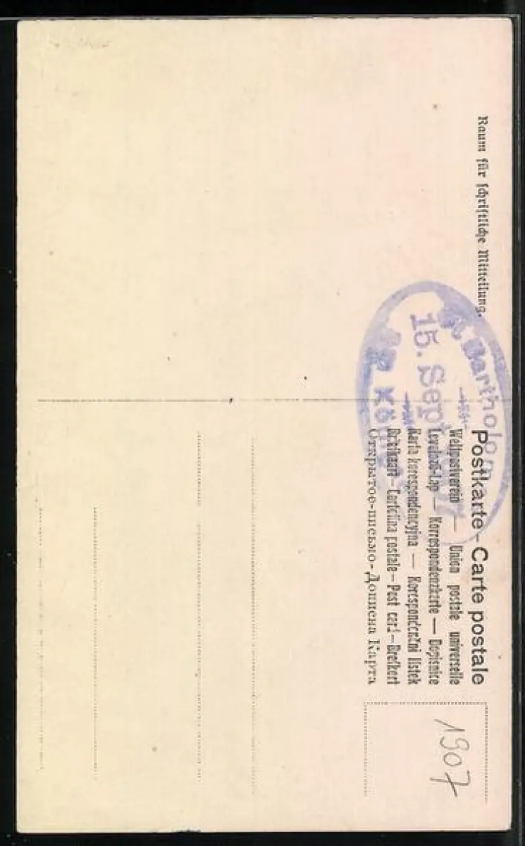 Personenbezogene Daten auf der Rückseite der Karte wurden durch blauen Textmarker unkenntlich gemacht. Die blauen Stellen sind auf die Vorderseite durchgeweicht und wirken sich negativ auf das Postkartenfoto aus