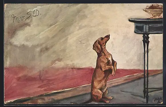 AK Dackel macht Männchen u. lugt nach einer Schale auf dem Tisch