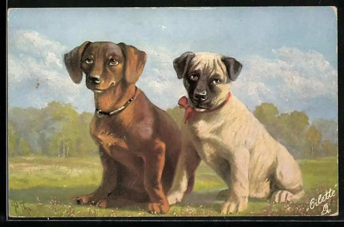 AK Dackel mit Gefährte auf einer Wiese, Portrait