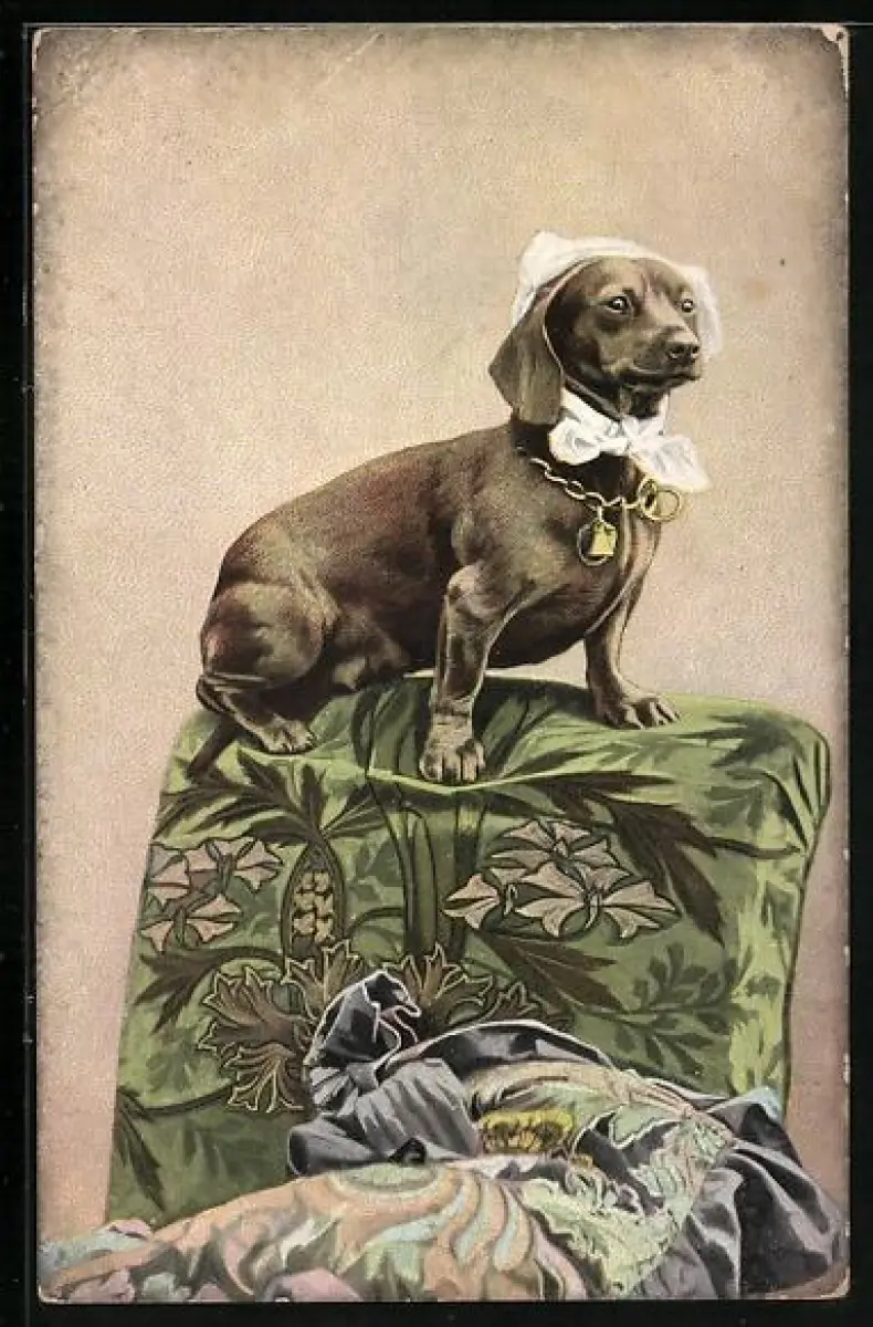 AK Dackel mit Haube & goldenem Halsband
