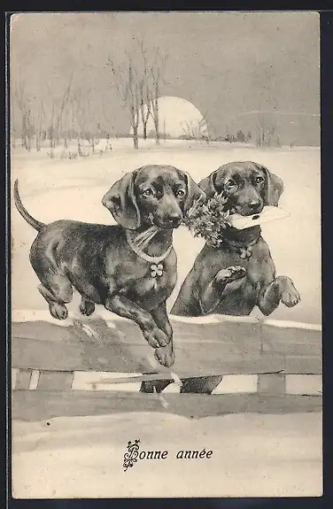 AK Dackel springen mit Brief u. Mistelzweig über einen Zaun, Neujahr, Kleeblätter